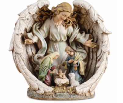 Escena de resina de gres del Nacimiento de la Sagrada Familia con el Ángel de la Guarda 10.5 x 8 x 3 pulgadas; hecho de duradero resinRPA2