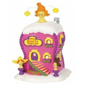 "Edificio iluminado del salón de belleza Dr. Seuss Grinch Village La Boutique, 6.75 pulgadas, multicolor. el edificio se ilumina con un cable de luz estándar y una foco de 120 V de 6 vatios (incluida)"